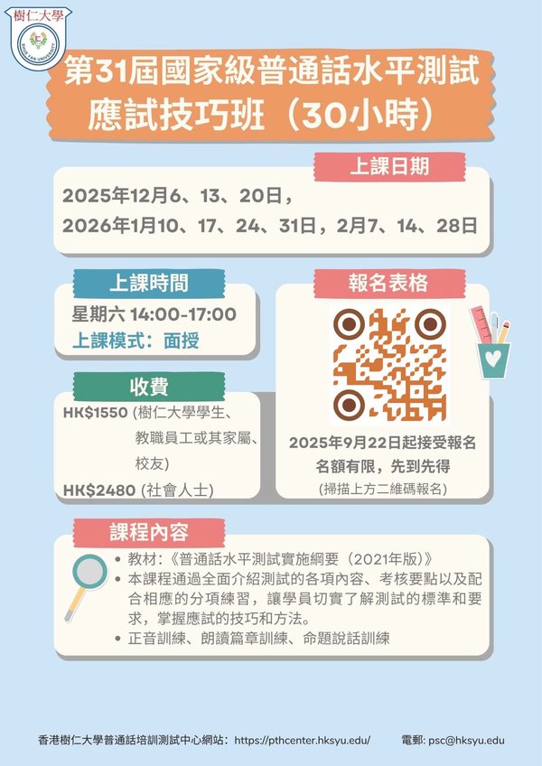 第31屆應試技巧班於2025年9月22月開始接受報名(同時接受同一屆國家級普通話水平測試、應試講座報名)。 有興趣參加的人士,請掃描海報中的二維碼 或 點擊此處報名。技巧班延長截止報名至 2025年12月11日(四) #。